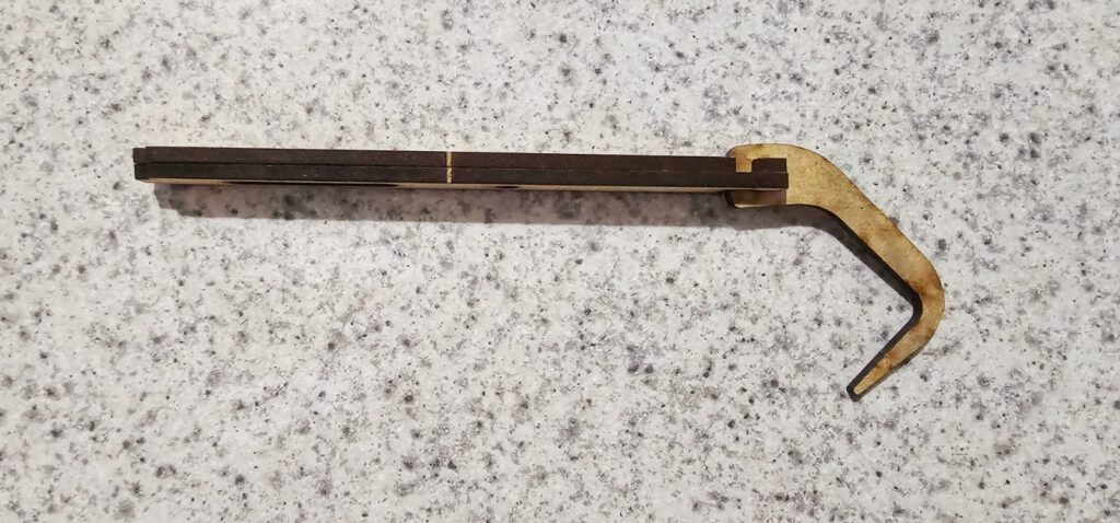 NOTA: para la nueva versión, los brazos están reforzados, por lo que hay que ponerlos dobles, como se muestra en las siguientes figuras, además, el gancho es abrazado por ambos lados para otorgar fuerza y rigidez. Se recomienda armar el brazo como se muestra antes de colocarlo y asegurarlo con el tornillo.
